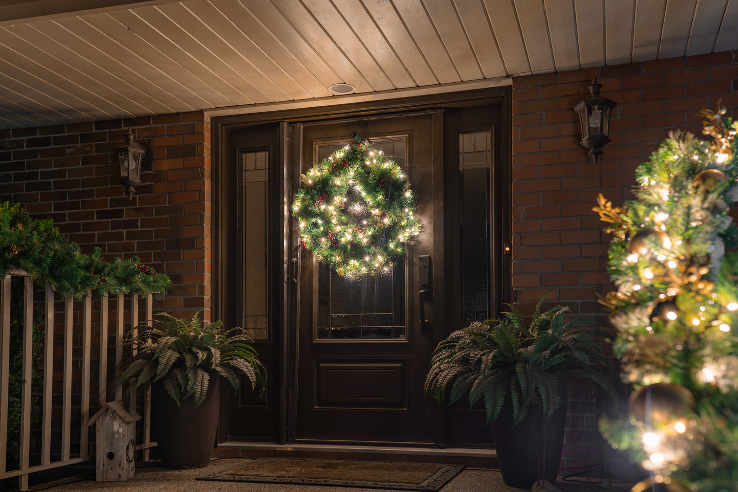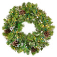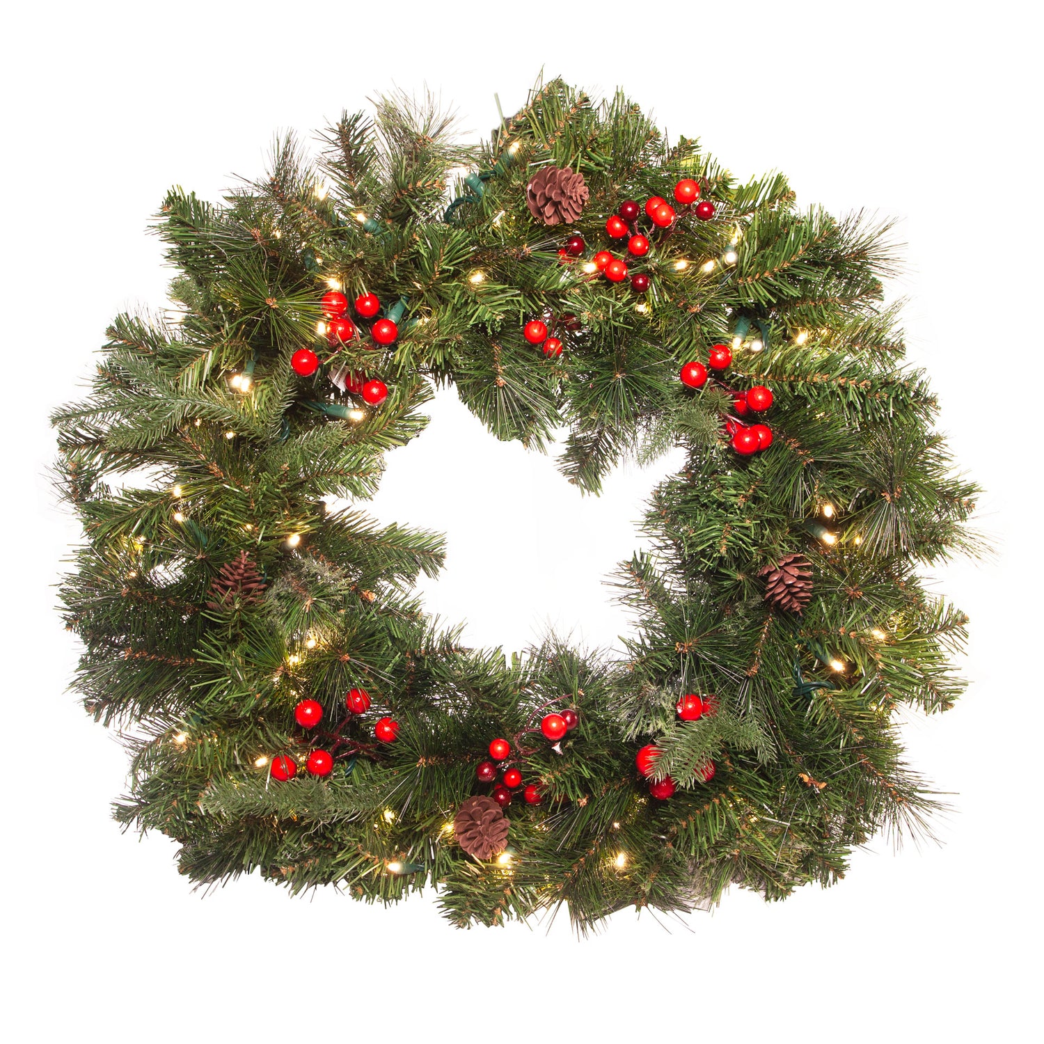 A classic wreath featuring realistic greenery, red berries, and pine cones wrapped in our beautiful Warm White 5mm mini-lights. Generously embellished with red berries and pine cones, this decor stands out, especially when combined with the Warm White commercial grade mini-lights woven throughout. Three types of needles are used providing a very natural looking wreath. Bolts using 1/2 inch nuts connect the sections together providing a very secure and rigid round shape.
