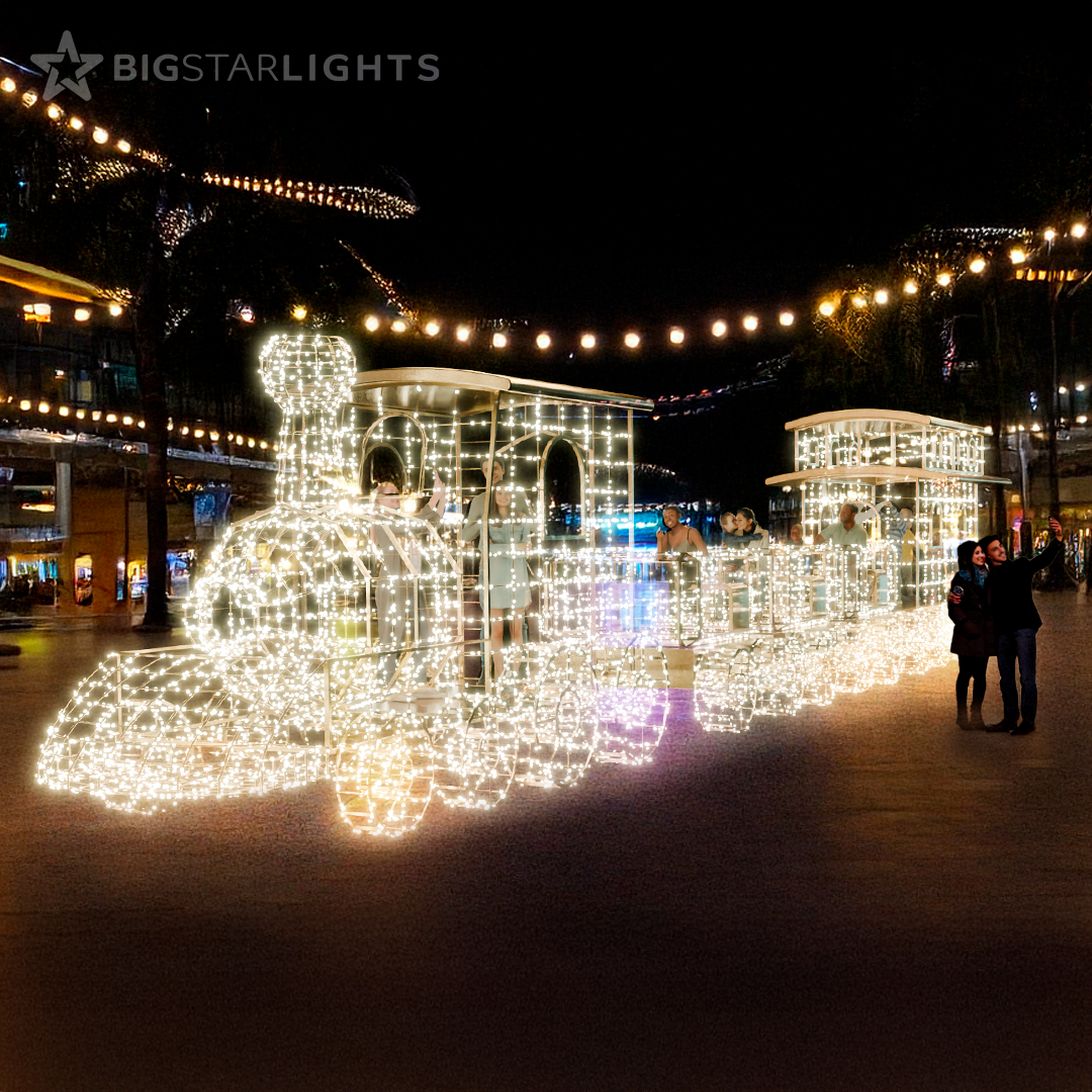 All aboard the magical Polar Express! This immersive lighted sculpture of a toy train will become one of the centerpieces of your Christmas display. Large groups of people can climb inside the engine, the cars, and even the caboose creating endless photo opportunities. The train comes with 3 cars plus caboose, but more or less cars can be added according to your budget. Any LED color is available although warm-white is the most popular. The frame is powder coated gold.