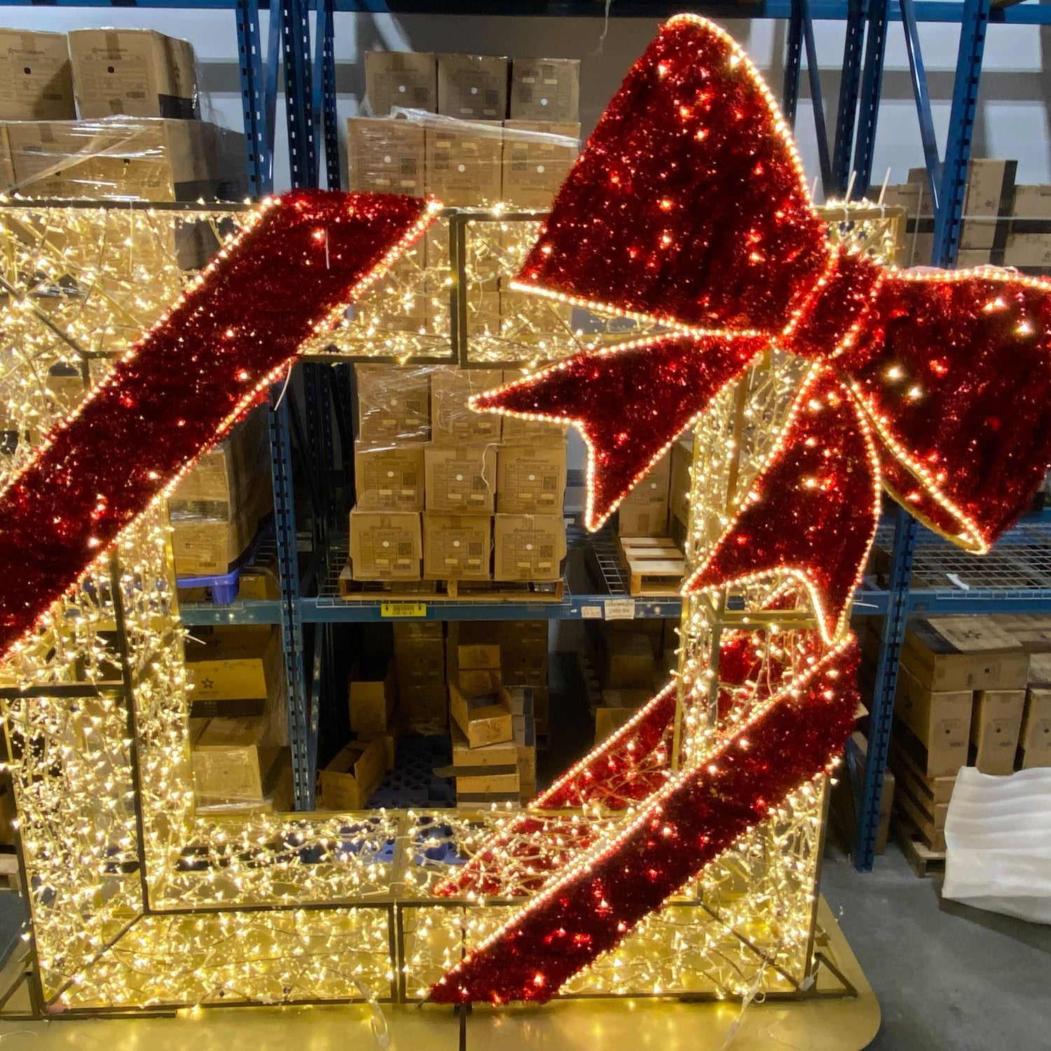 Gather the friends and family for a beautifully lit portrait that's fit to make it on the front of a Christmas card. A stylishly lit red 3D bow compliments the design (other bow colors available upon request). It's self-standing with large steel plates on the bottom that can be additionally anchored for strong winds. Various LED colors are available, although the most popular is warm-white with 15% of the lights twinkling in pure-white, combined with a red bow. An additional tag on the upper left corner is made of frosted acrylic can be used to display your business logo.