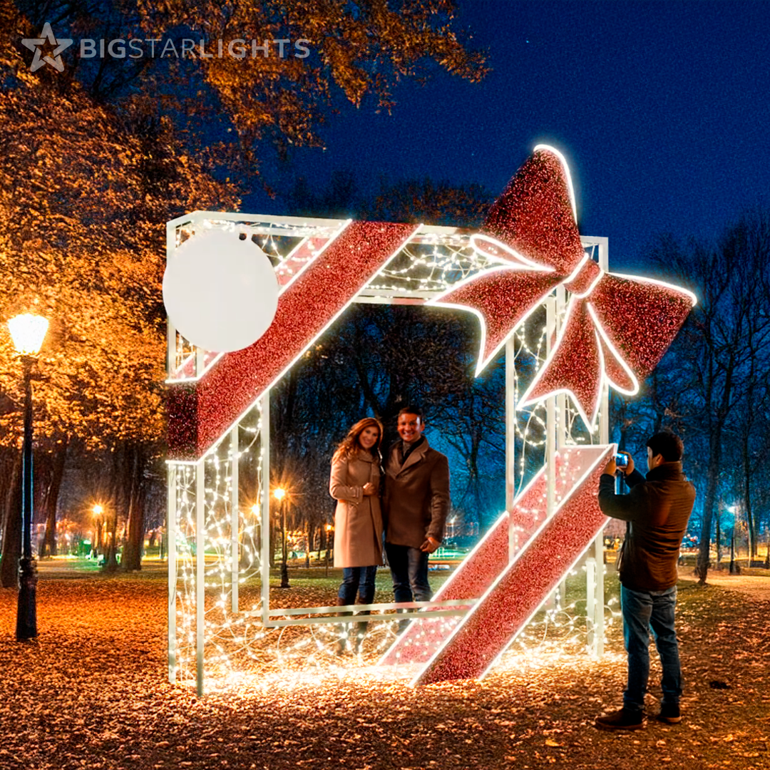 Gather the friends and family for a beautifully lit portrait that's fit to make it on the front of a Christmas card. A stylishly lit red 3D bow compliments the design (other bow colors available upon request). It's self-standing with large steel plates on the bottom that can be additionally anchored for strong winds.