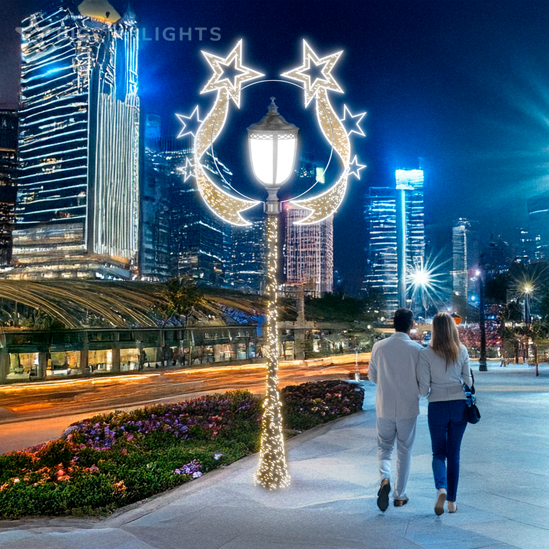 The Halo Twin Stars Polemount is a beautifully illuminated decoration designed to enhance holiday streetscapes, shopping districts, and public spaces. Featuring two radiant stars encircled by a glowing halo, this pole-mounted display adds a festive yet refined touch to any outdoor setting. The smooth, neon-like illumination comes from high-quality ribbon LEDs, offering a consistent and vibrant glow that stands out in any holiday display.