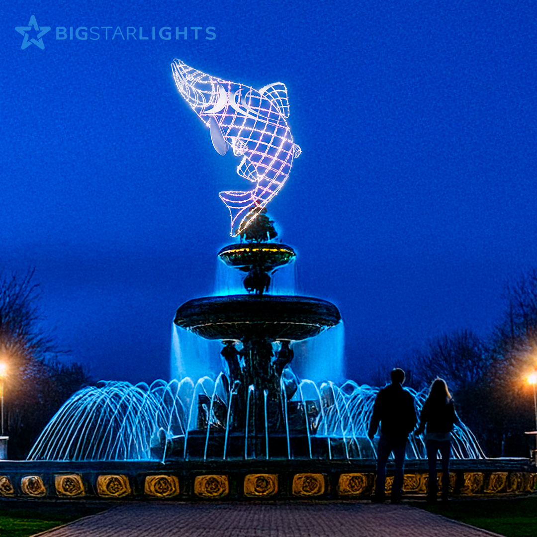 Fish are a great addition near rivers and ponds, especially when carefully placed above them. Consult your electrician for running power through water. This fish sculpture can be made in any color and be designed in varying poses. They are typically designed to sit on posts. Gold frames with warm-white lights are the most commonly requested color, however any color is available upon request.