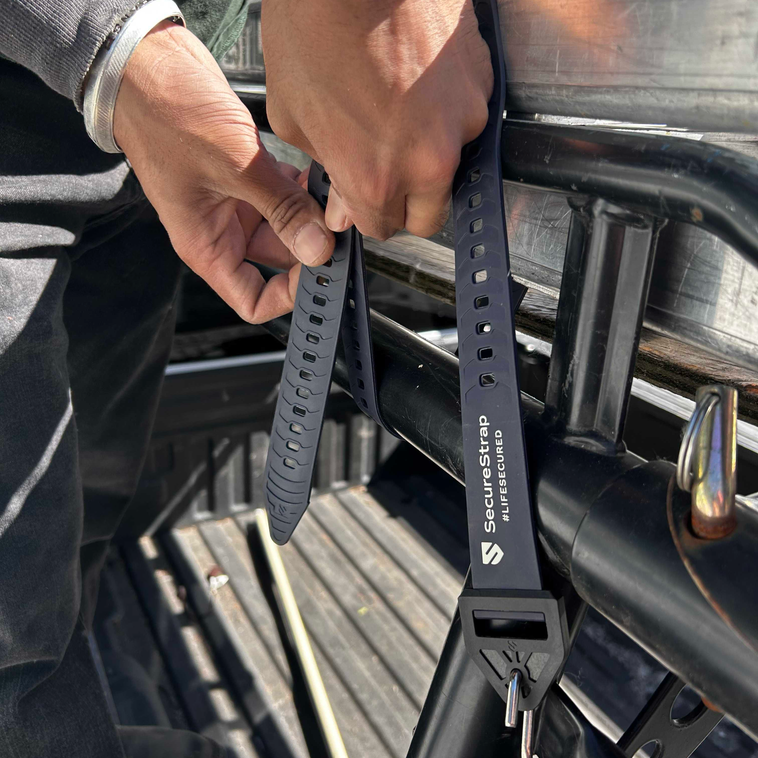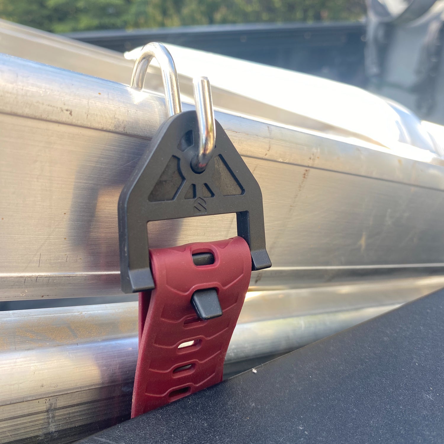The strap that ties anything up, down, and together. There are thousands of uses and this convenient utility strap with a unique hook mechanism will quickly become a part of your daily life. Work, play, and everything in between, the Hook Strap has your life secured. Crafted from stretchy, high-performance TPU polymer, the strap offers adjustable and secure tension in every imaginable climate from tropical marine to frigid mountain tops. It's UV and tear resistant, but if a tear does happen to form, it won't run. Hooks can be removed if desired so you can permanently bolt the buckle to your racks or equipment. It includes a mechanism for securing the tail of your strap from flapping in the wind. Throw away the injury-prone, eye-damaging bungee cords and avoid ratchet straps that are susceptible to overtightening ladders. Switch to Secure Straps.